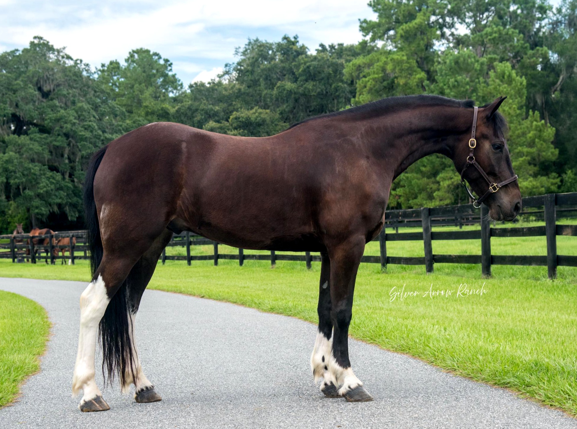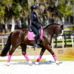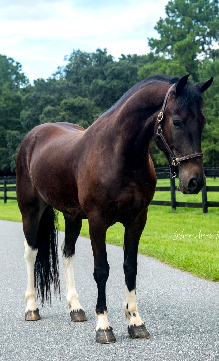 DSR Mystic Primrose aka Rosé, is a coming 5 year old papered Friesian Cross standing 15.2h tall. This sweet mare is filled with talent, flash, and has a heart of gold. She is currently schooling training and first level dressage with plenty of potential to climb up the levels. She scored a 70+% at her first show and marched around without batting an eye. She has three correct, balance gaits that are super comfortable to sit. She is easy in the contact and moves off the leg nicely. She is not a hot, forward ride, but not a kick ride either making her a perfect mount for adult amateur or junior riders. She is simply steady, sane, safe, and a smart girl that is always happy to please. She is currently jumping novice height with scope for plenty more. This girl is brave and honest to everything put in front of her. She doesn’t get hot or drag you to the fences. She steadily approaches and will leave whereever you ask her to. She loves to jump but will be more than happy to be a dressage queen as well. She enjoys both equally and clearly has talent in any direction. Rose is solid to hack out, play through obstacles, head out on a trail, and has even enjoyed swimming in a pond. We find this girl to be wise beyond her years. She retains everything you teach her making her every rider’s dream. Rose will load, tie, trailer, travel as well as bath, be pampered, and loved on like the queen she is. She enjoys all aspects of her job even just hanging out in the ring while her rider sips a glass of Rosé. This girl checks all the boxes and more of young horse. She is sound, no maintenance, no vices, no issues. She has a recent full PPE and clean Xrays on file so she is ready to hop right on your trailer. She is barefoot, an easy keeper, and a pleasure to have in the barn. Ocala, fl. Sale only.
