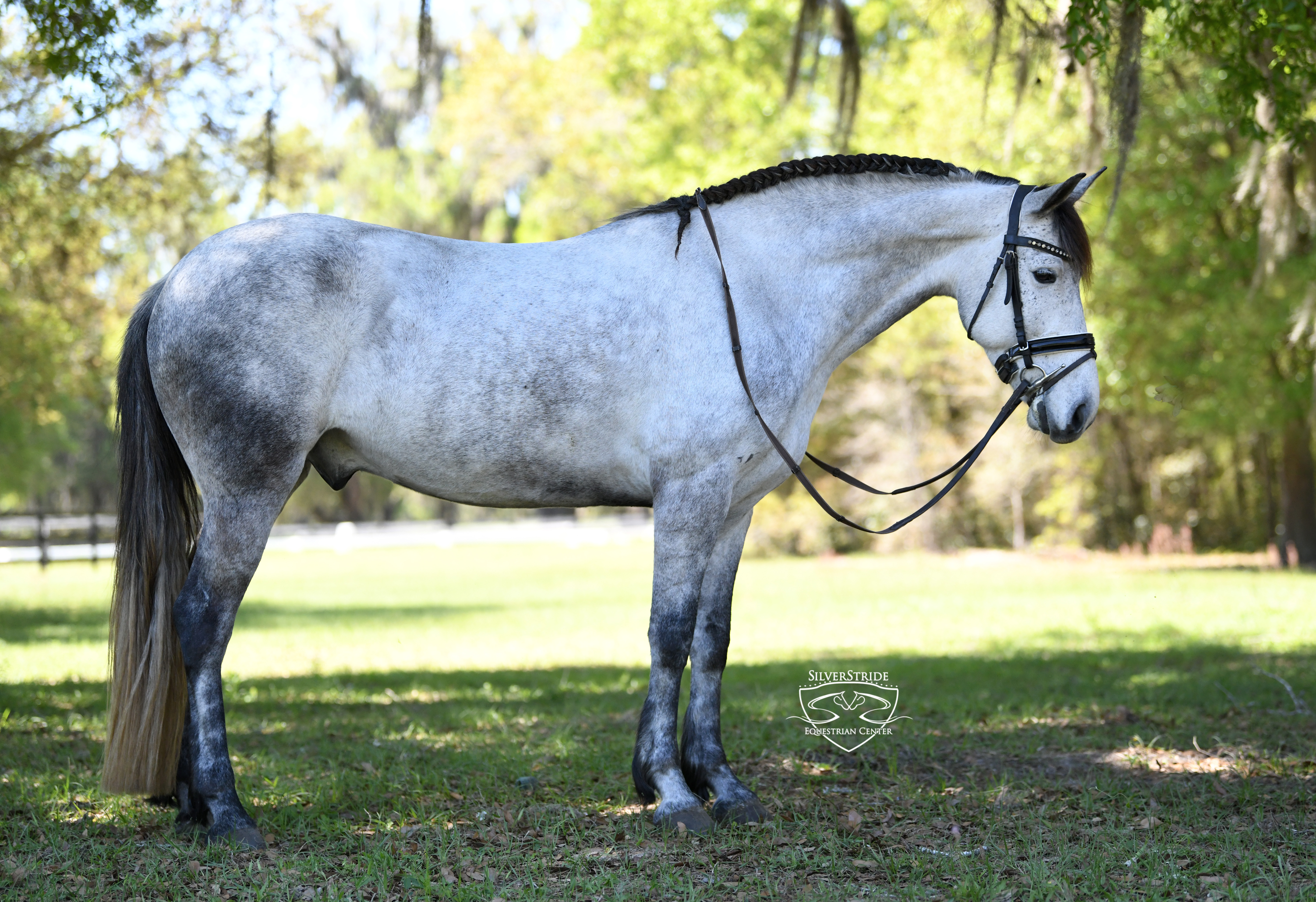 Winter Wonderland is a stunning dapple grey unicorn looking to make all your dreams come true. Coolio, as we call him in the barn, is such a sweet heart. He is a puppy dog personality type that simply wants head scratches and love. He has three lovely gaits. His canter feels like you are on a cloud. He is smooth, simple, steady, and easy going. Coolio has been dabbling in a bit of everything. From cross country, trails, low level dressage, stadium, kidlet rides, and hacking out regularly. Coolio has traveled off property on a regular basis always proving himself to be the same horse wherever he goes. He is happy in any direction. Whether it’s dressage, jumping, or a trail ride, he is your go to guy. He is a pleasure to be around in the barn. He is a no fuss guy, easy going, and an easy keeper. He is gentle, kind, easy to love, and certainly easy on the eyes. He goes whatever pace you ask. He really is the perfect adult amateur/ kiddo pace that everyone is searching for. Coolio is not a hot horse or a slug to move around either. He is simply beautifully steady, fun, and super enjoyable. Loads, ties, and trailers. He gets along well with others and is just a laid back, fun boy. He is barefoot with clean xrays on file. Coolio stands 15.2h. No vices, issues, or quirks. Ocala, Fl. No holds. Sale only.